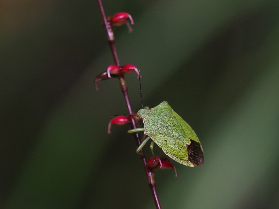 ミズヒキの実は、上面が赤く下面は白い紅白になっています。これもアントシアニンの生成に日光が関わっているのでしょうね。そんなミズヒキに、緑色をしたカメムシが止まっていました。どうやらエゾアオカメムシという種類のようです。