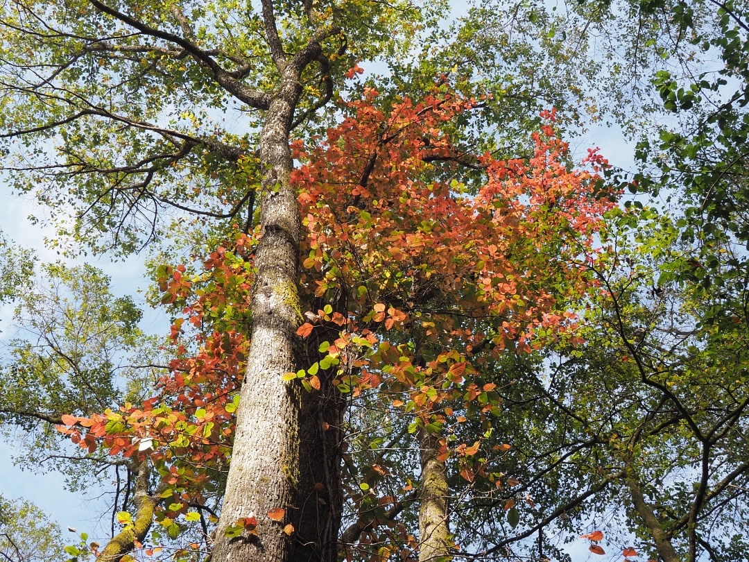 ツタウルシは、他の木の幹にへばりつきながら成長し、横枝を伸ばして葉を茂らせます。そのため、絡まれた木の梢ではなく、幹の周囲が朱に染まります。