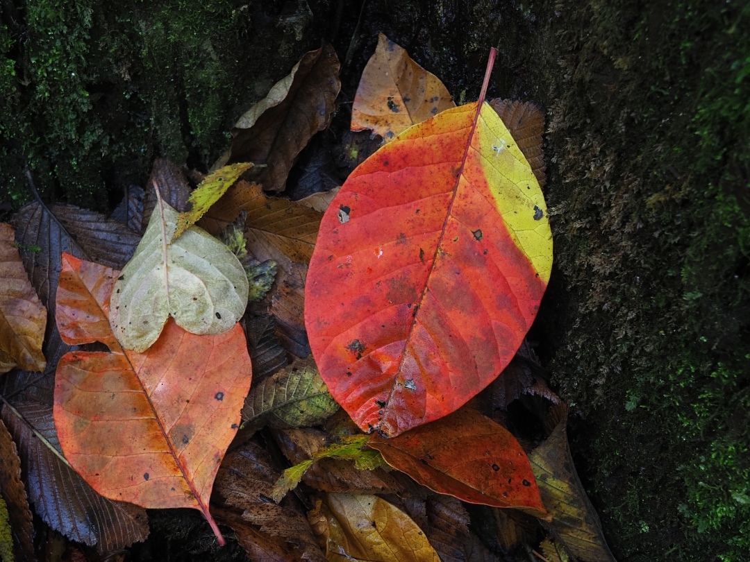 くっきりと赤と黄色に色分けされたツタウルシの落葉を見つけました。紅葉は、秋になり葉を落とす準備が始まると、日光が当たることで赤いアントシアニン色素が生成され、いっぽうで緑色のクロロフィル色素が分解されることで葉が赤くなります。葉が重なって日光が遮られていた部分は、アントシアニンが生成されないので、葉に元々含まれるカロチノイド色素で黄色くなるのです。