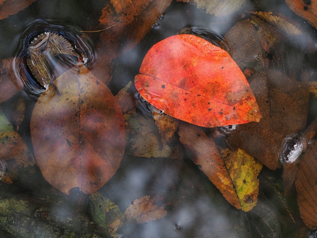 どんぐり池に赤い落葉が沈んでいました。ツタウルシの葉です。見上げると、ハルニレに絡んだツタウルシの紅葉が、ずいぶんと進んでいることに気付きました。