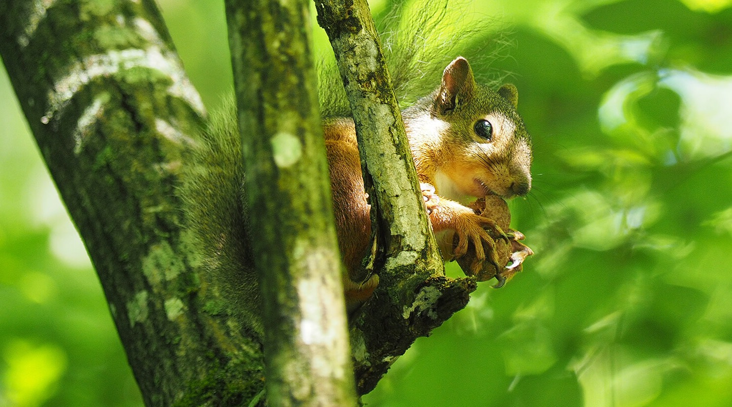8月も下旬になると、野生のクルミ「オニグルミ」が実り始めます。栄養豊富なクルミの実は、ニホンリスの大好物。頭上から何かをかじる小さな音が聞こえてきたら、そっと顔をあげてみましょう。