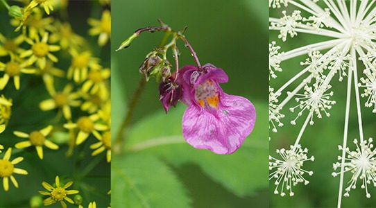 オレンジ色が鮮やかな「フシグロセンノウ」、涼やかな紫の「ソバナ」、白いレースのような「シシウド」など、色も形も様々な花が咲き競います。可憐な姿に隠された、子孫を残すための工夫にも注目です。
