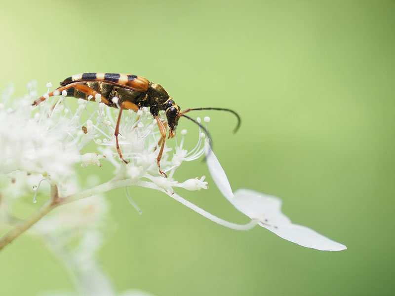 梅雨が明けて天気が良いと、昆虫たちの活動も活発になります。今回も前回に引き続き、7月31日に撮影した写真から昆虫たちを紹介しましょう。まず1枚目は、ヤマアジサイの花の上で見つけたヨツスジハナカミキリ。名前の通り、背中(前翅)に4本のすじ模様があり、花に集まるカミキリムシです。見ていると、さかんにおしべから花粉をなめとっていました。