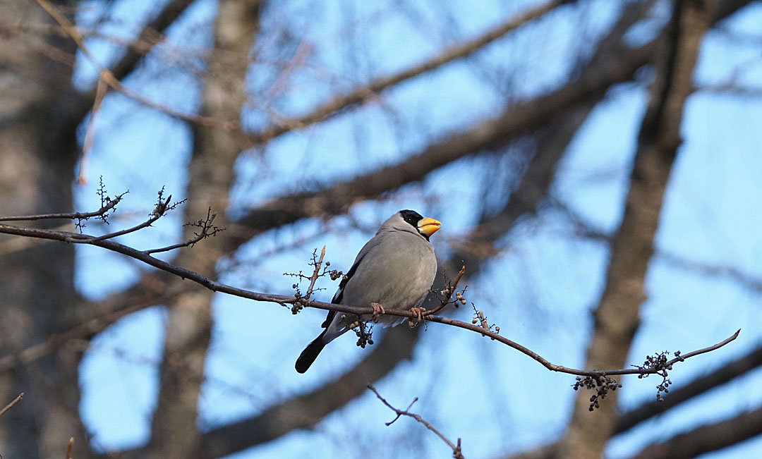 約3時間で調査終了。この日はカラ類があまり群れていなかったこともあり、確認できた個体数は少なめでした。また、先週チラッと声を聞いたレンジャク類には出会えず。もう抜けてしまったのかと思いましたが、調査の最後の最後で上空から「ヒ〜」という声が降ってきました。姿は見られませんでしたが、まだ周辺に滞在しているようです(追伸:翌日30羽前後のヒレンジャクの群れに遭遇しました)。