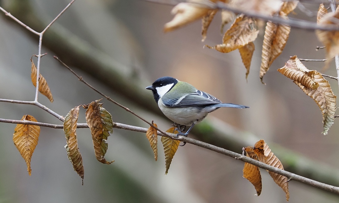 軽井沢野鳥の森の紅葉も終盤となり、森の中はかなり見通しが効くようになりました。モミジやカラマツの色付いた葉がわずかに残る11月14日、毎月恒例の「軽井沢野鳥の森」鳥類調査を実施しました。1枚目の写真は、ミソサザイの沢で出会ったシジュウカラです。