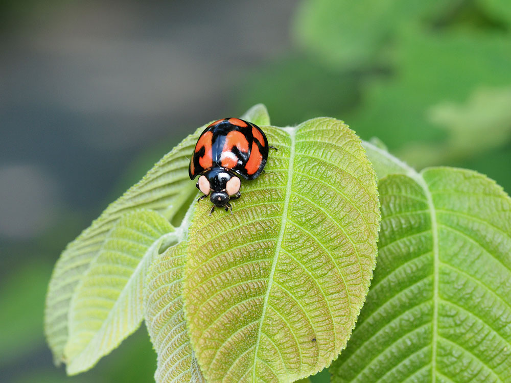「国設軽井沢野鳥の森」の入り口には、オニグルミの木が何本かあります。その一つは草刈りの際に切られてから再び枝が伸びてきた株で、人の背の高さより低く葉を茂らせています。先日そこで、大きなテントウムシを見つけましたよ。