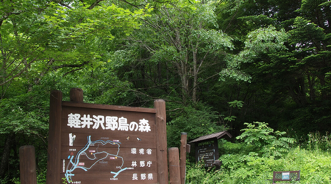 軽井沢野鳥の森は、クリやミズナラ、カラマツなどが茂る国設の森です。年間で約80種類の野鳥を観察できるほか、四季折々の草花が咲き誇り、ツキノワグマやニホンカモシカ、ムササビなどの多くの野生生物が息づいています。