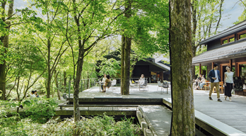 星野エリア内に位置するショッピングエリア。湯川の清流に寄り添うように自生していた100 本を超えるハルニレ(春楡)の木立を活かし、9 棟の瀟洒な建物を広いウッドデッキでつないだ「小さな街」。「軽井沢の日常」をコンセプトにした、16 の個性的なショップ・レストランが、別荘ライフを豊かに彩ります。