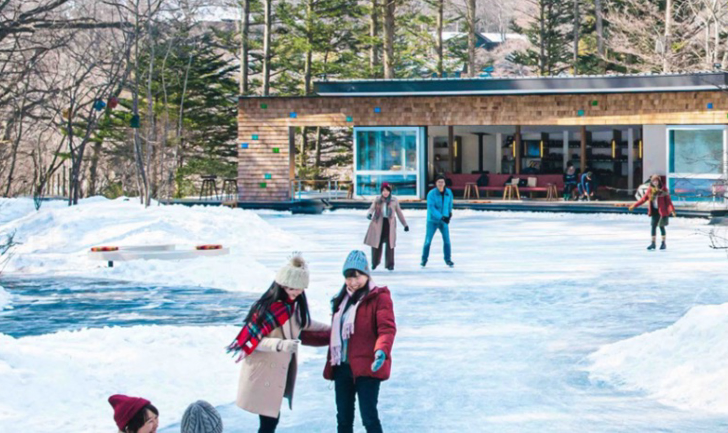 お昼の後は腹ごなしにスケートリンクへ!お子様用のそりもあるのでお子様でも安心です。森の中で滑るスケートは楽しさいっぱい。 スケートの後は「ハルニレテラス」のカフェで一息。 温かい飲み物を飲みながら冷えた身体を温めましょう。