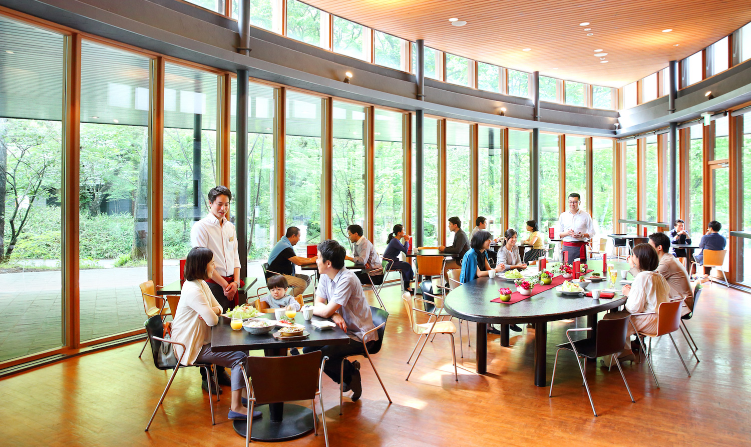 村民食堂は、この美しい村・軽井沢を訪れる人々をおいしくもてなすカジュアルダイニングです。「信州彩り御膳」「味噌山賊焼き定食」など、信州らしい食材を使い、郷土料理をアレンジしたメニューをご用意しています。夜はこだわりの日本酒やワインと一品料理で、ゆったりとした時間をお過ごしください。