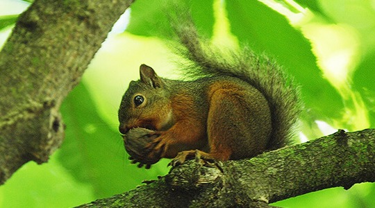 8月も下旬になると、野生のクルミ「オニグルミ」が実り始めます。栄養豊富なクルミの実は、ニホンリスの大好物。頭上から何かをかじる小さな音が聞こえてきたら、そっと顔をあげてみましょう。